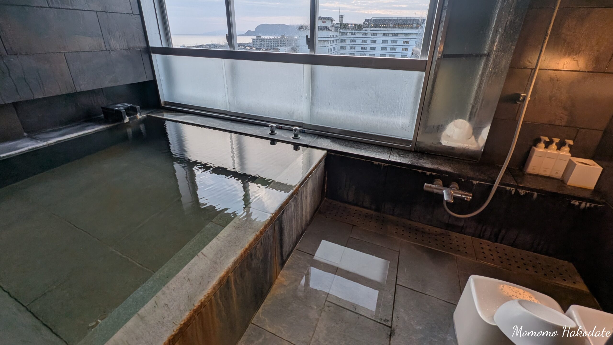 特筆すべきは、そのロケーションです。大浴場の露天風呂は、湯の川温泉地区で一番高い場所に位置しており、非常に開放的。