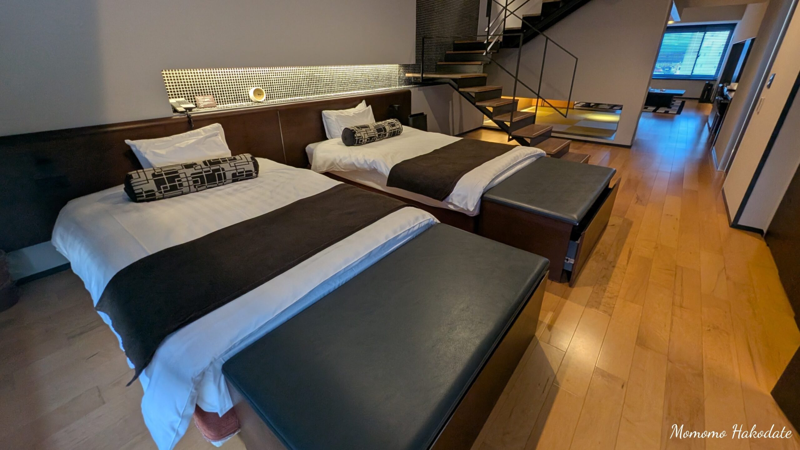 望楼NOGUCHI函館の客室は、ツイン客室でなんと120㎡もあるメゾネットタイプ。広々とした空間の中には、非日常を満喫できるサービスが盛りだくさんです。