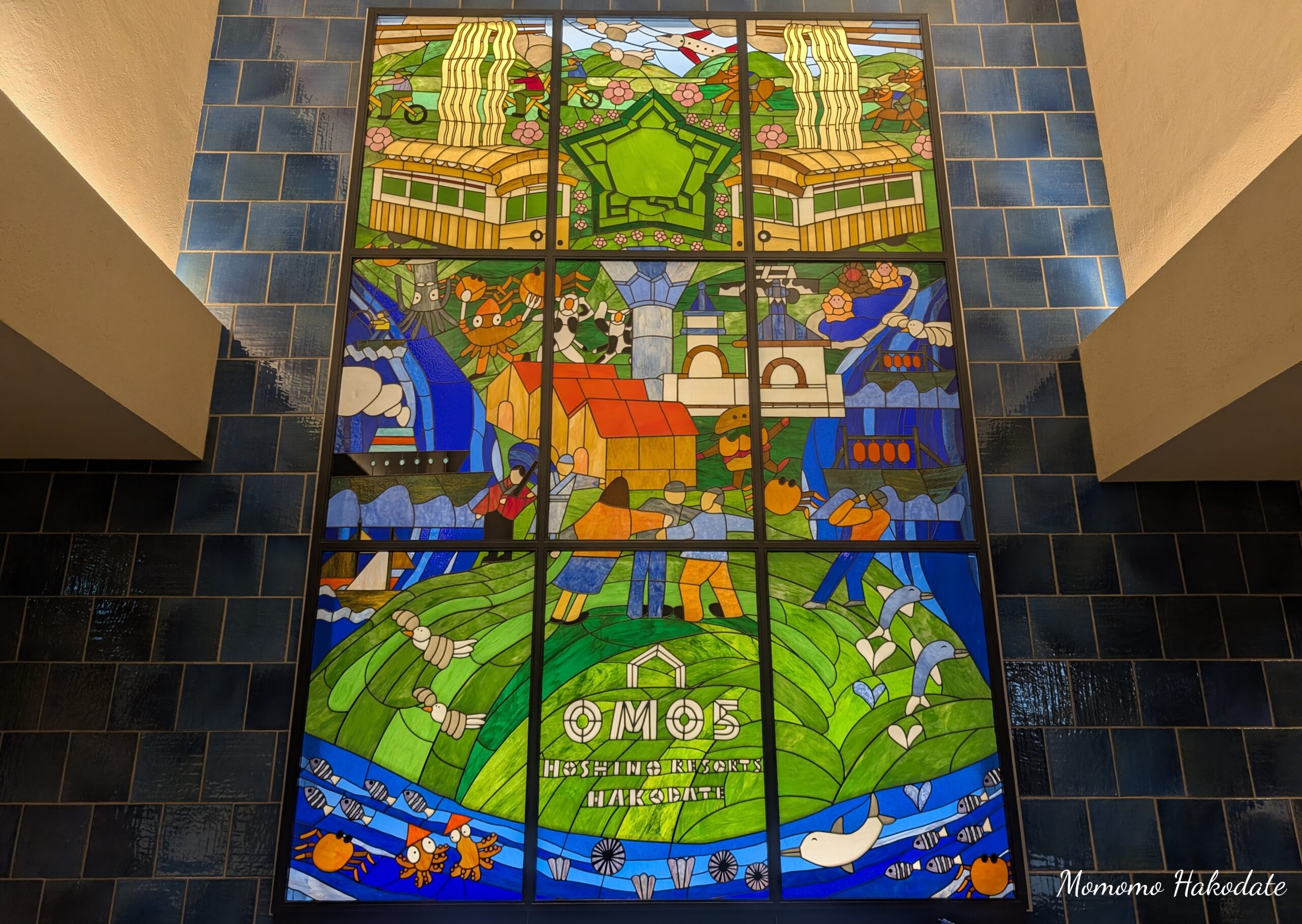 フロントに到着すると、函館の名所が描かれた鮮やかなステンドグラスがお出迎え。