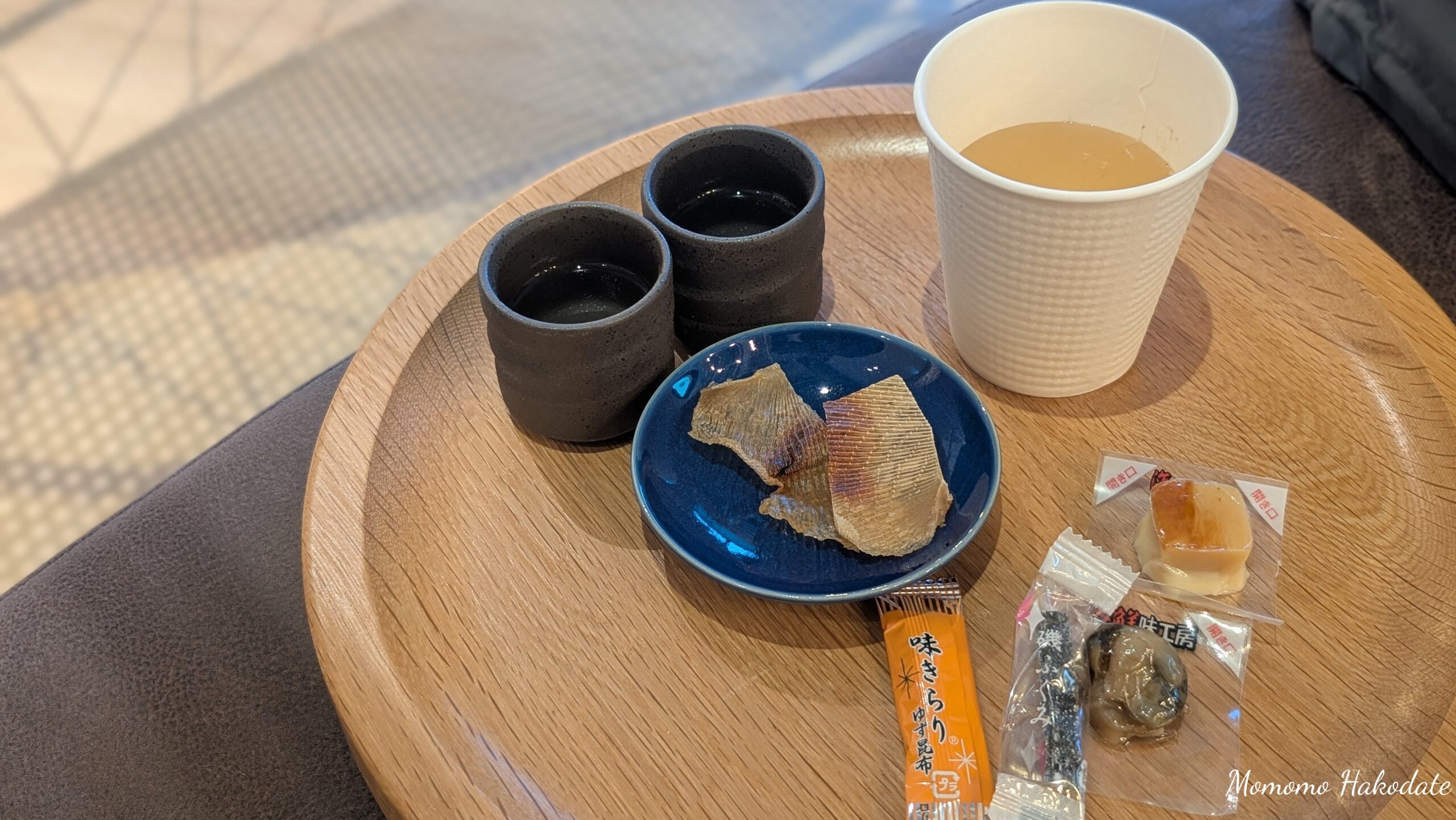 サービスの昆布茶は「ほぼ出汁!」と言いたくなるほどの濃厚な旨味。地酒「五稜」の試飲とおつまみもあります。