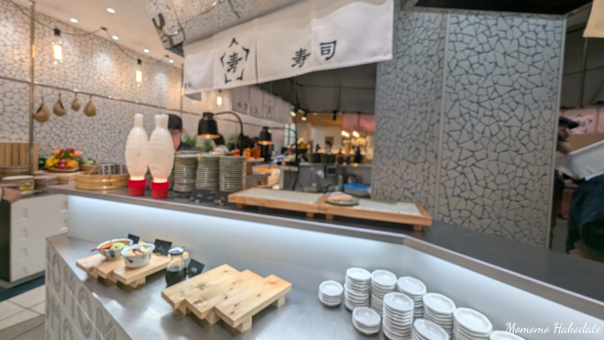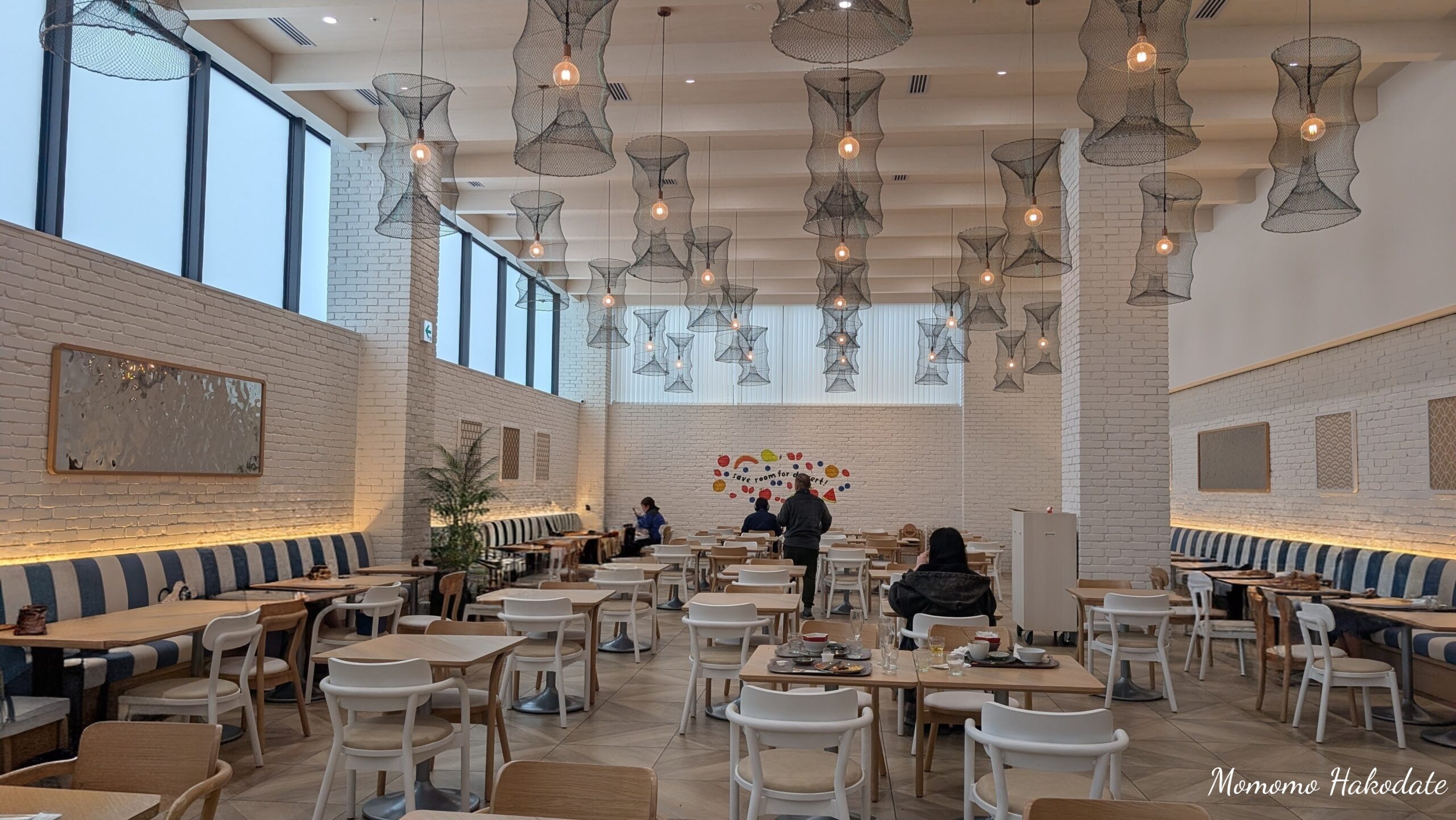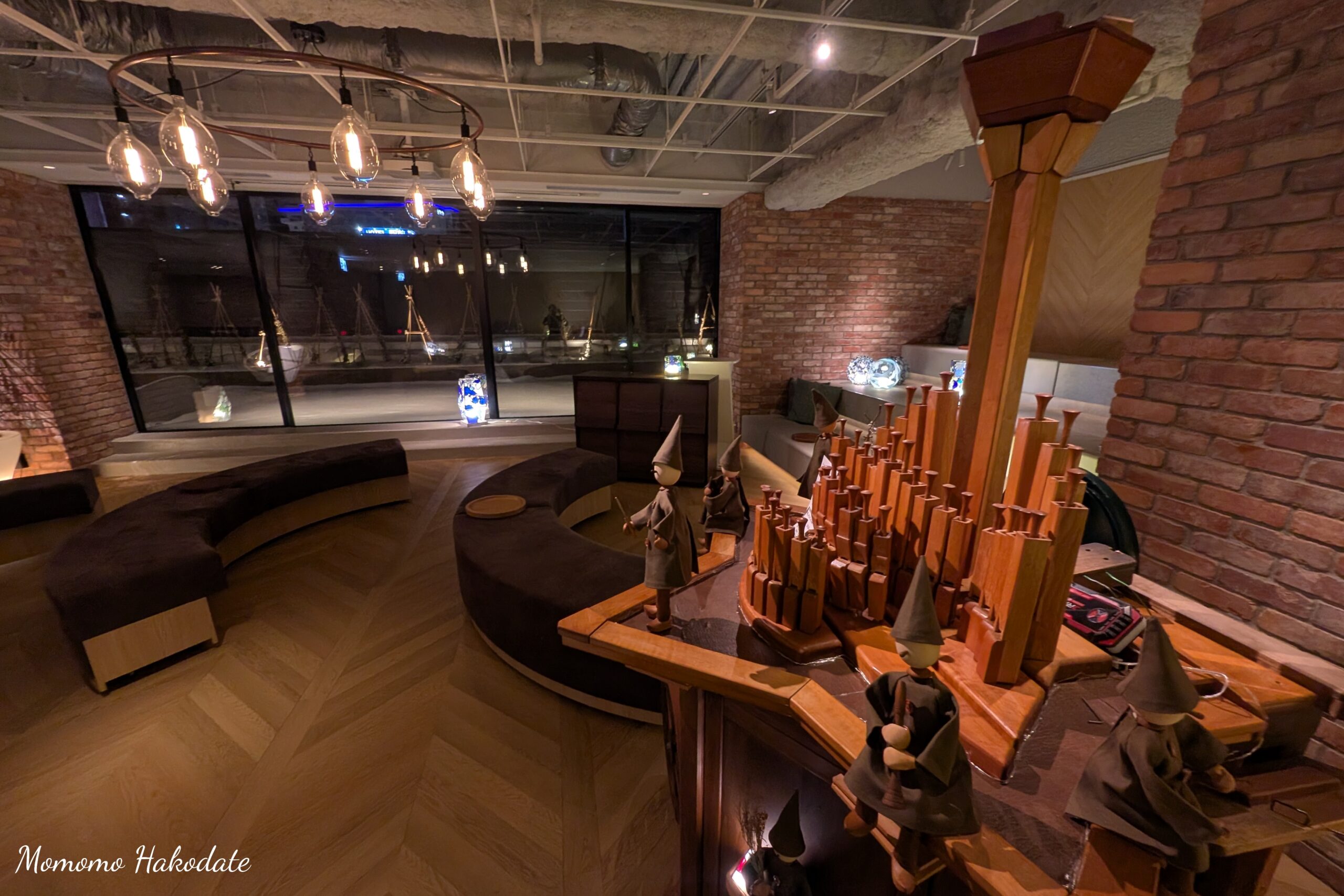 館内はどこを切り取ってもフォトジェニック。赤レンガ風の壁や、イカ釣り船の漁火(いさりび)をモチーフにした照明など、函館らしさがスタイリッシュに表現されています。