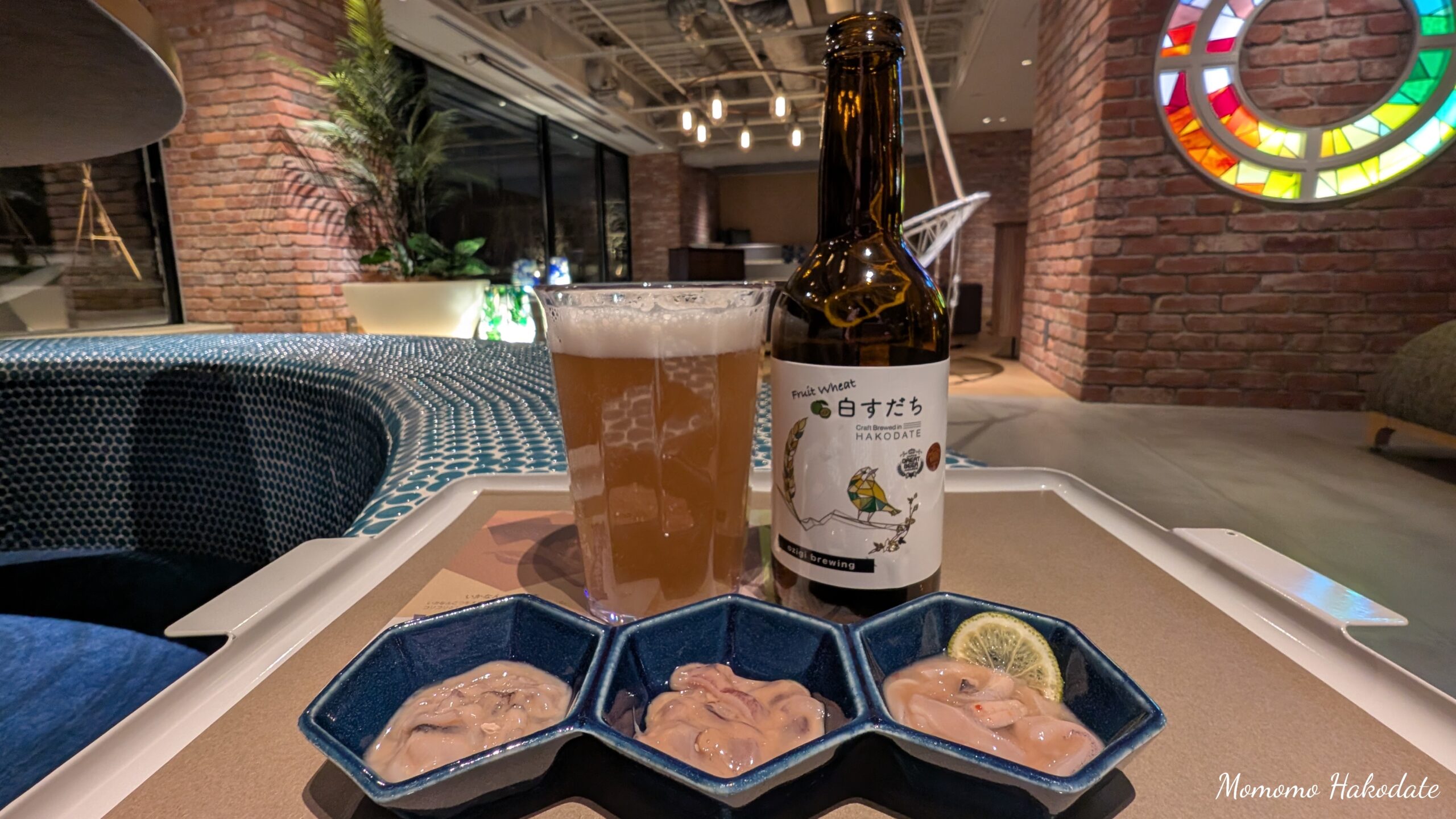 「小田島水産」の塩辛3種とクラフトビールのセット。木樽仕込みの塩辛は角が取れたまろやかな味で、白すだちビールとのペアリングが最高です!