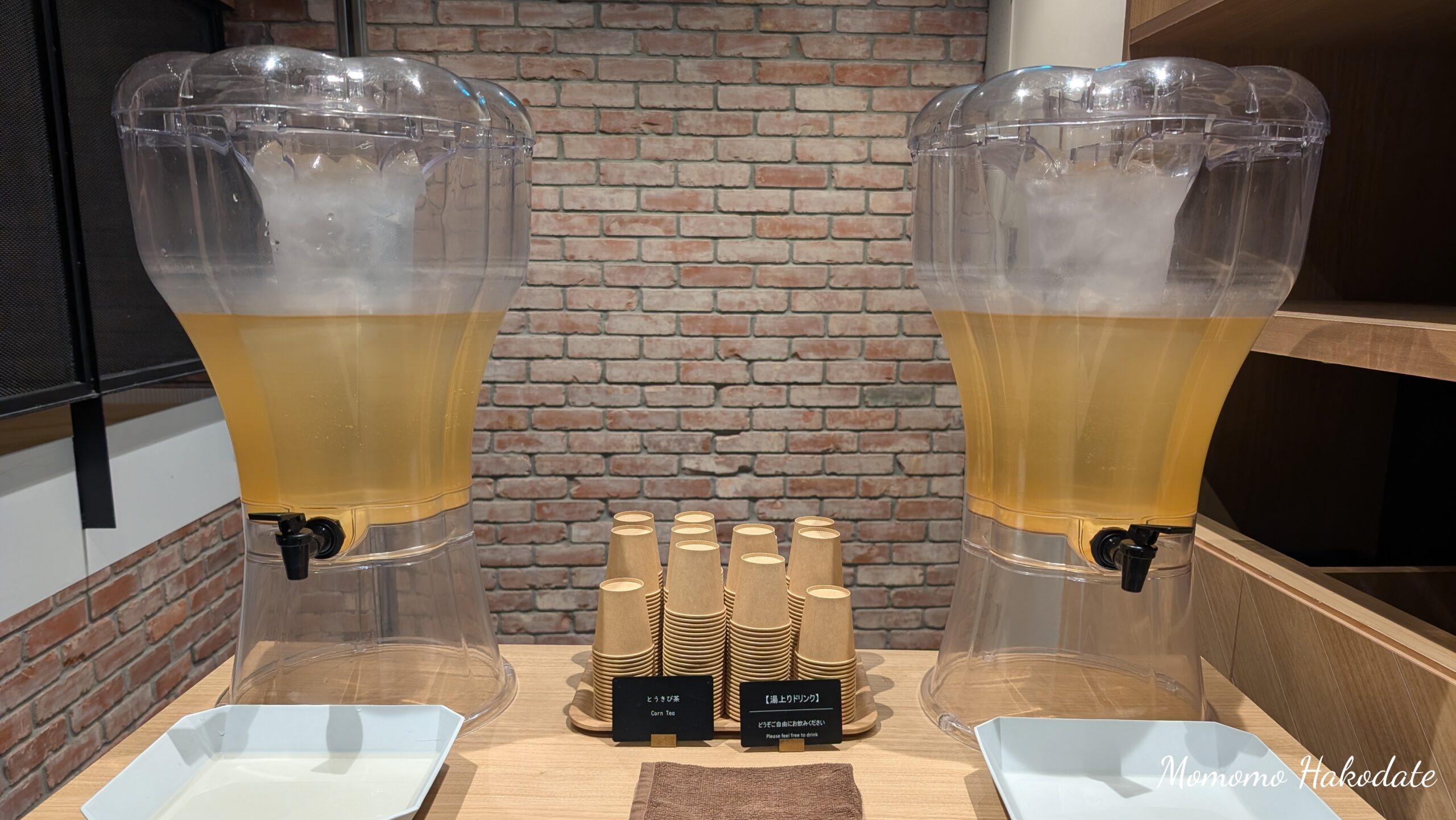 嬉しいサービス:入り口には「とうきび茶」が用意されており、香ばしい味で水分補給も完璧です。