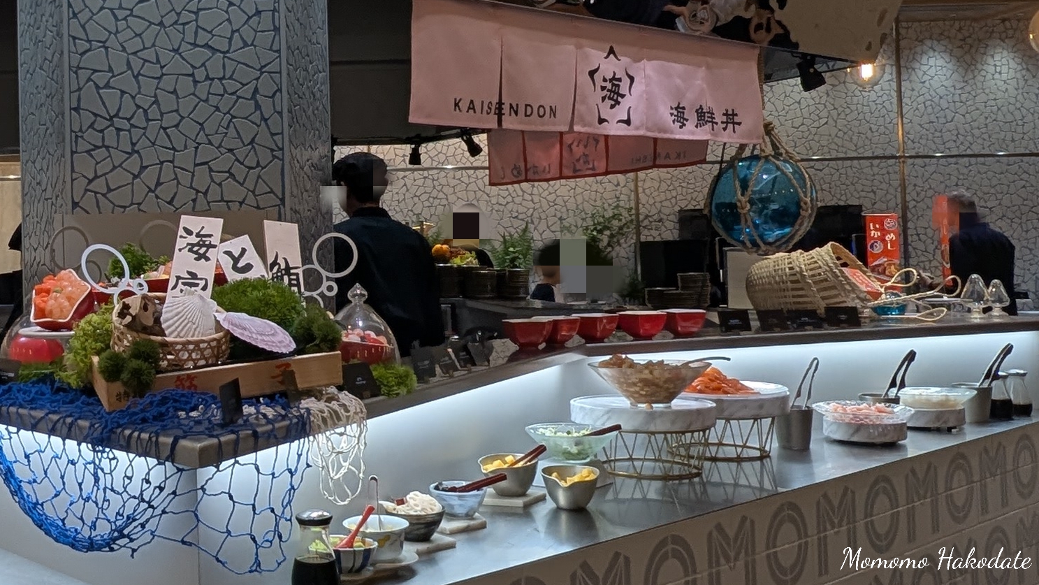 海鮮丼コーナー。かわいらしい五稜郭の形をした器。貝柱・マグロ・サーモン・甘エビ・イカなど、好きなようにトッピング。